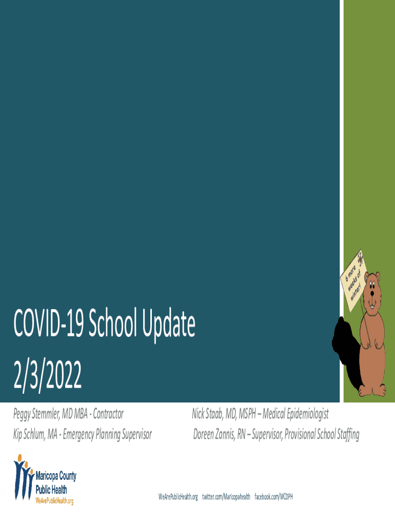 COVID-19 School Update 2/3/2022 Peggy Steamer, MD MBA Contractor Kip Schism, MA Emergency Planning Supervisor Nick Stab, MD, MPH Medical Epidemiologist Doreen Tennis, RN Supervisor, Provisional School