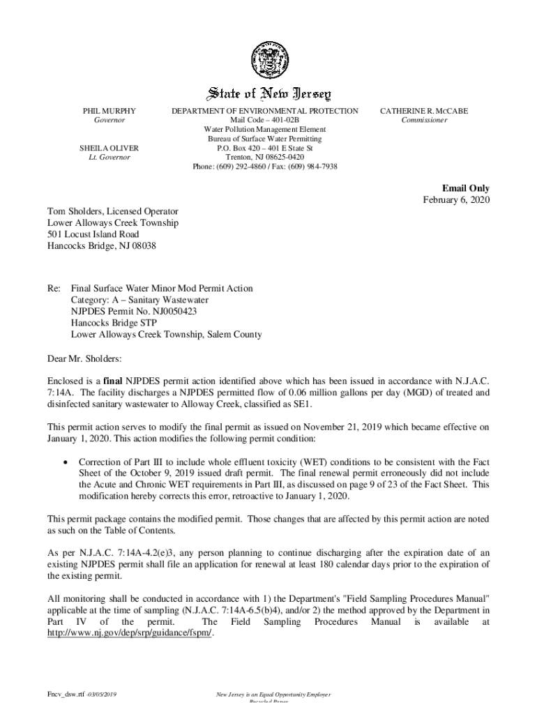 PHIL MURPHY Governorship OLIVER Lt. GovernorDEPARTMENT OF ENVIRONMENTAL PROTECTION Mail Code 40102B Water Pollution Management Element Bureau of Surface Water Permitting P.O. Box 420 401 E State St