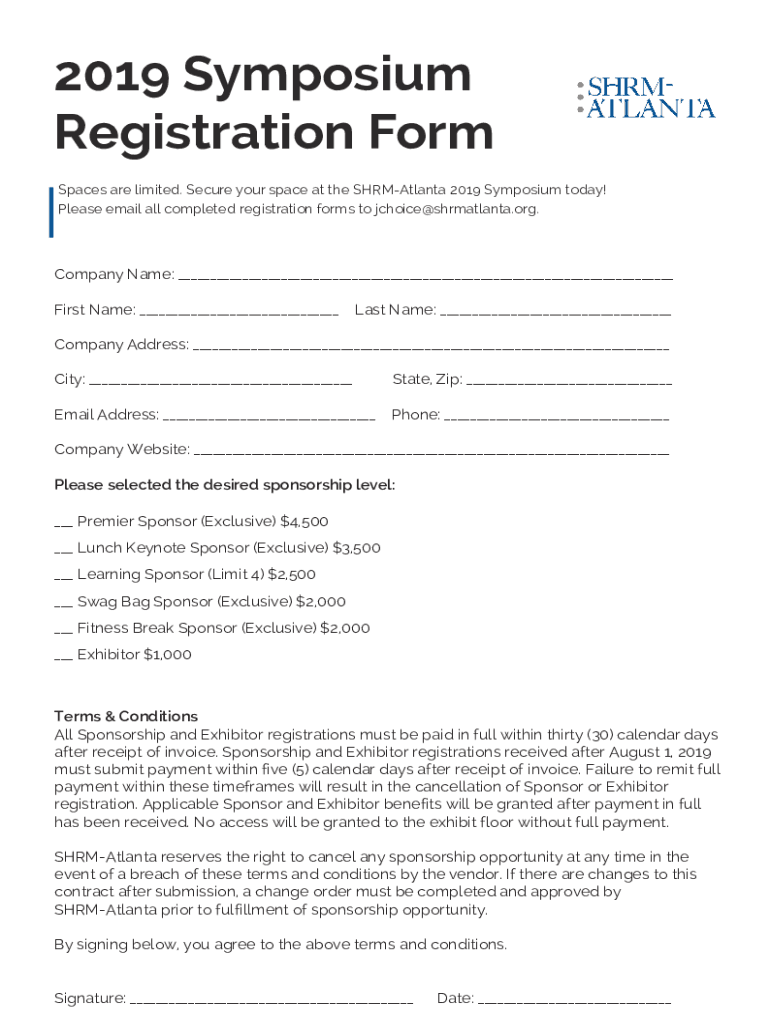 2019 Symposium Registration Form Spaces are limited. Secure your space at the SHRMAtlanta 2019 Symposium today! Please email all completed registration forms to choice×shrmatlanta.org. Company Name: