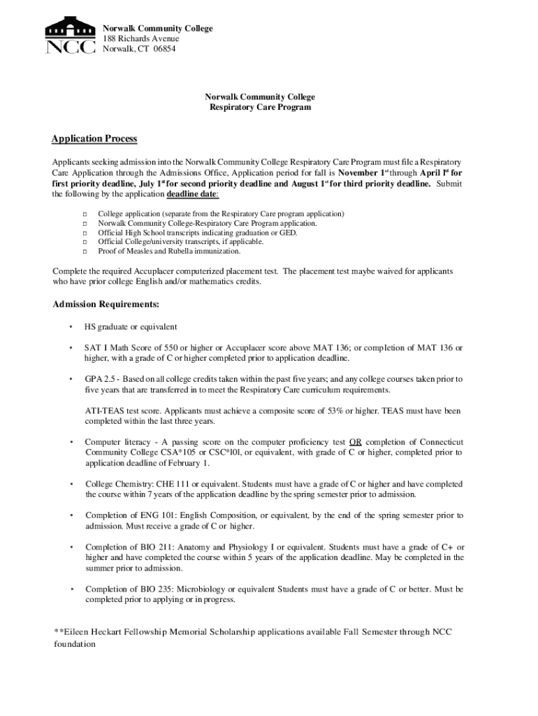 Norwalk Community College 188 Richards Avenue Norwalk, CT 06854Norwalk Community College Respiratory Care ProgramApplication Process Applicants seeking admission into the Norwalk Community College