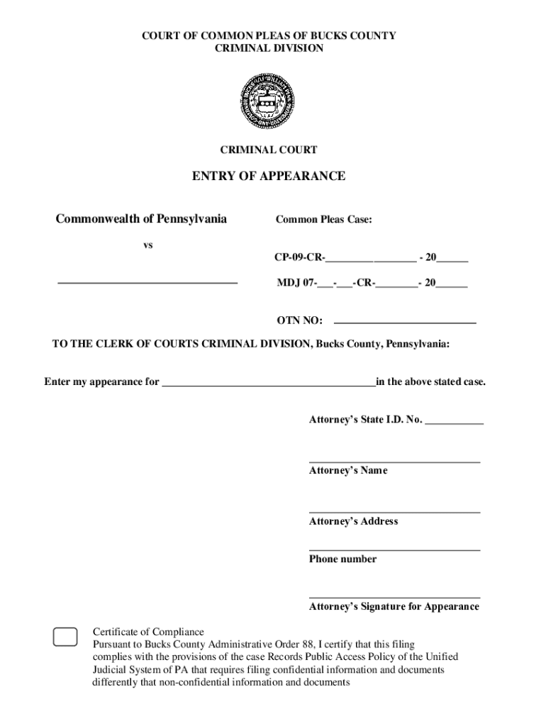COURT OF COMMON PLEAS OF BUCKS COUNTY CRIMINAL DIVISIONCRIMINAL COUNTRY OF APPEARANCE Commonwealth of PennsylvaniaCommon Pleas Case:vs CP09CR___ 20___ MDJ 07______CR___ 20___OTN NO: TO THE CLERK OF