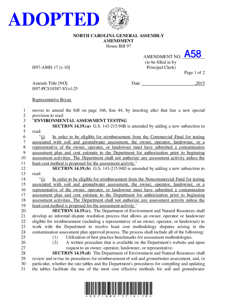 ADOPTED NORTH CAROLINA GENERAL ASSEMBLY AMENDMENT House Bill 97A58AMENDMENT NO. ___ (to be filled in by Principal Clerk) Page 1 of 2H97AMH17 [v.10×Amends Title [NO] H97PCS10387SVxf25Date,2015Representative