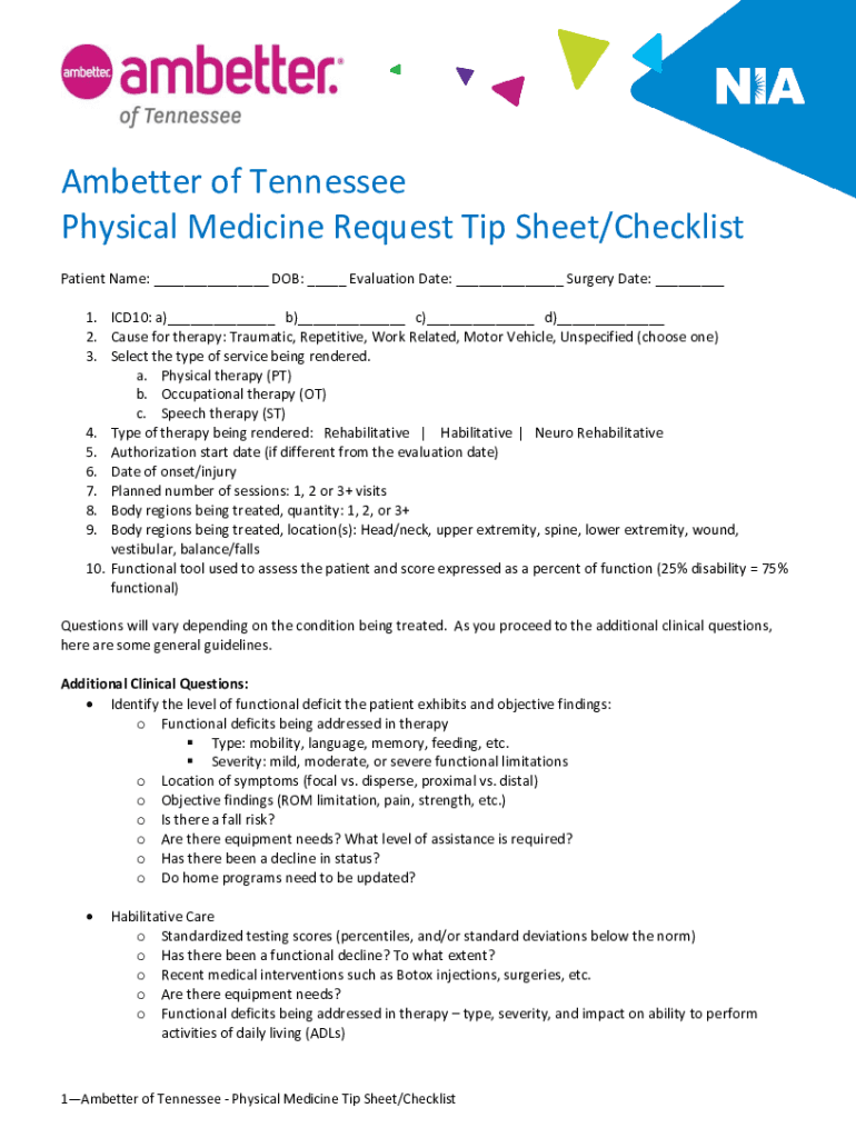 Am better off Tennessee Physical Medicine Request Tip Sheet/Checklist Patient Name: ___ DOB: ___ Evaluation Date: ___ Surgery Date: ___ 1. ICD10: a)___ b)___ c)___ d)___ 2. Cause for therapy: Traumatic,