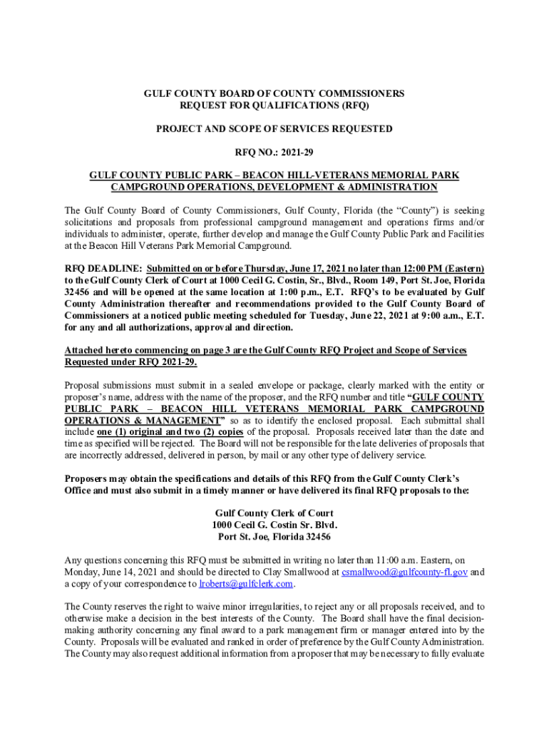 GULF COUNTY BOARD OF COUNTY COMMISSIONERS REQUEST FOR QUALIFICATIONS (RFQ) PROJECT AND SCOPE OF SERVICES REQUESTED RFQ NO.: 202129 GULF COUNTY PUBLIC PARK BEACON HILLVETERANS MEMORIAL PARK CAMPGROUND