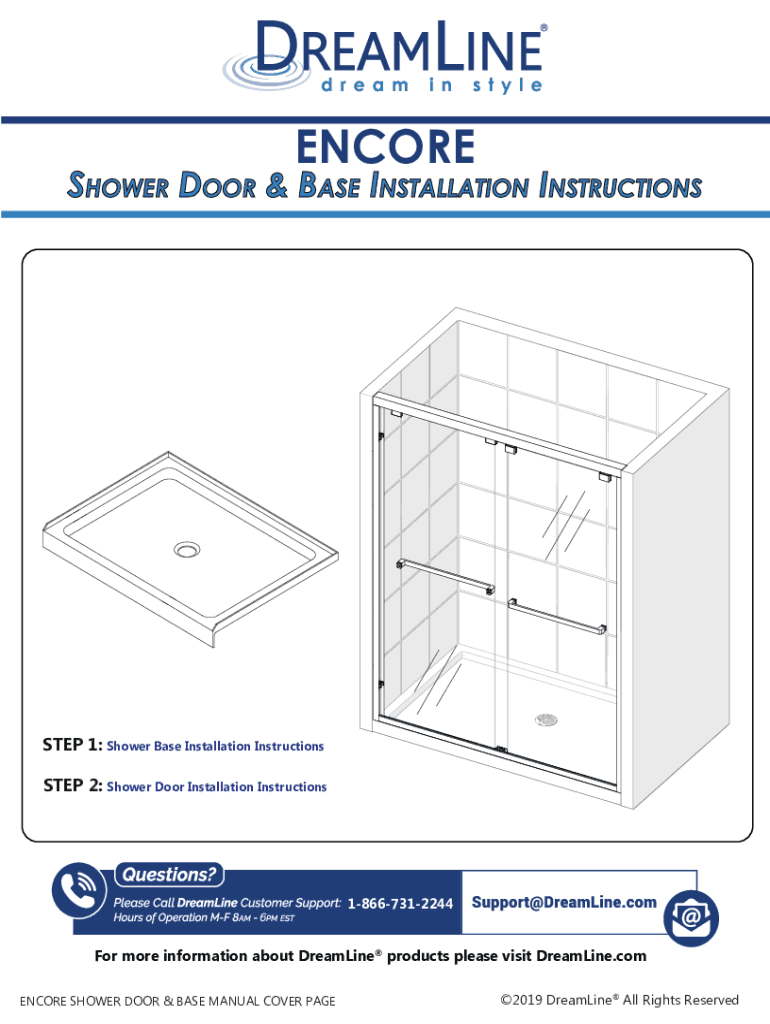 ENCORESHOWER DOOR & BASE INSTALLATION INSTRUCTIONSSTEP 1: Shower Base Installation Instructions STEP 2: Shower Door Installation Instructions18667312244For more information about Dreamlike products