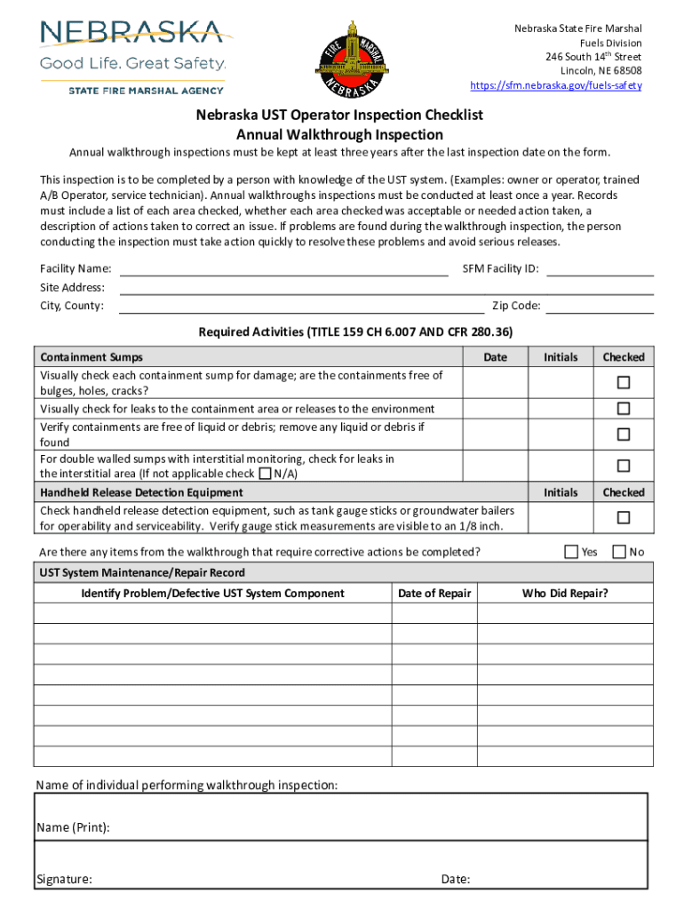 Nebraska State Fire Marshal Fuels Division 246 South 14th Street Lincoln, NE 68508 https://sfm.nebraska.gov/fuelssafetyNebraska MUST Operator Inspection Checklist Annual Walkthrough InspectionAnnual