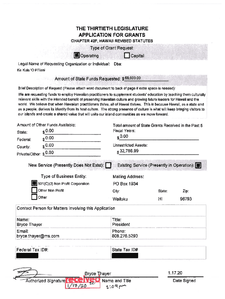 THE THIRTIETH LEGISLATURE APPLICATION FOR GRANTS CHAPTER 42F, HAWAII REVISED STATUTESType of Grant Request'd Capital×ii Operating Legal Name of Requesting Organization or Individual:DBA:KE Lula \'O