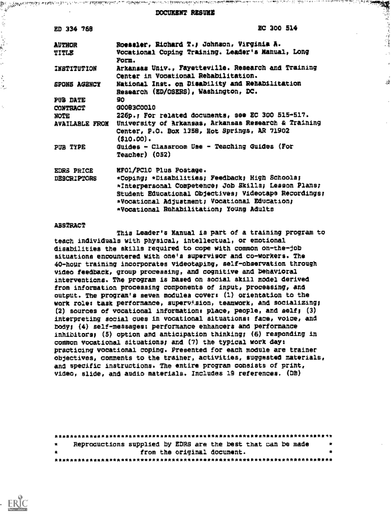 DOCUMENT RESUME EC 300 514ED 334 768AUTHOR TITLERoessler, Richard T.; Johnson, Virginia A. Vocational Coping Training. Leader\'s Manual, Long Form.INSTITUTIONSPONS AGENCY PUB DATE CONTRACT NOTE AVAILABLE