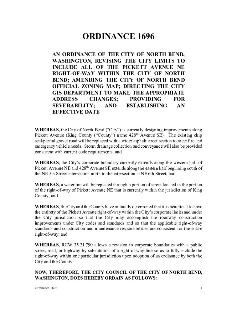 ORDINANCE 1696 AN ORDINANCE OF THE CITY OF NORTH BEND, WASHINGTON, REVISING THE CITY LIMITS TO INCLUDE All the PICKETT AVENUE NE RIGHTOFWAY WITHIN THE CITY OF NORTH BEND; AMENDING THE CITY OF NORTH