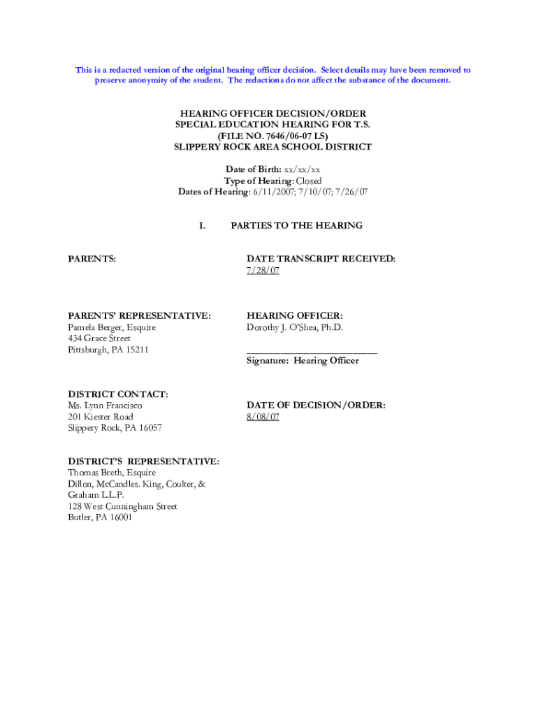 This is a redacted version of the original hearing officer decision. Select details may have been removed to preserve anonymity of the student. The redactions do not affect the substance of the document.
