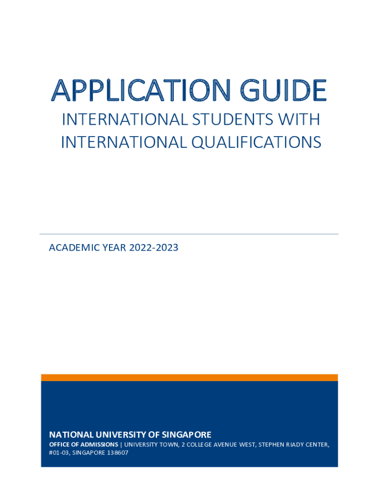 APPLICATION GUIDE INTERNATIONAL STUDENTS WITH INTERNATIONAL QUALIFICATIONSACADEMIC YEAR 20222023NATIONAL UNIVERSITY OF SINGAPOREOFFICE OF ADMISSIONS | UNIVERSITY TOWN, 2 COLLEGE AVENUE WEST, STEPHEN