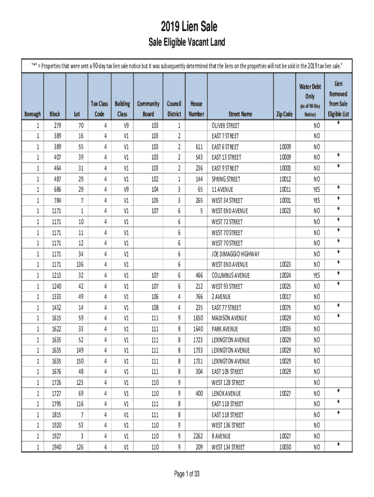 2019 Lien Sale Eligible Vacant Land \”*\” Properties that were sent a 90day tax lien sale notice, but it was subsequently determined that the liens on the properties will not be sold in the 2019