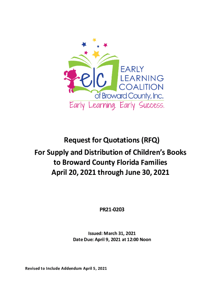 RequestforQuotations(RFQ) ForSupplyandDistributionofChildrensBooks toBrowardCountyFloridaFamilies April20,2021throughJune30,2021 PR210203 Issued:March31,2021 Dated:April9,2021at12:00Noon RevisedtoIncludeAddendumApril5,2021TableofContents