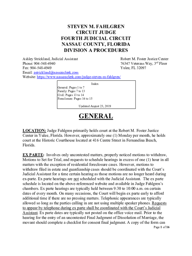 STEVEN M. DAHLGREN CIRCUIT JUDGE FOURTH JUDICIAL CIRCUIT NASSAU COUNTY, FLORIDA DIVISION A PROCEDURES Ashley Strickland, Judicial Assistant Robert M. Foster Justice Center Phone: 9045484940 76347