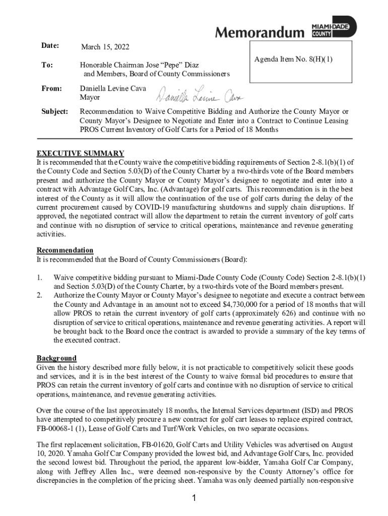 Date:March 15, 2022To:Honorable Chairman Jose Pepe Diaz and Members, Board of County CommissionersFrom:Daniella Levine Cave MayorSubject:Recommendation to Waive Competitive Bidding and Authorize the
