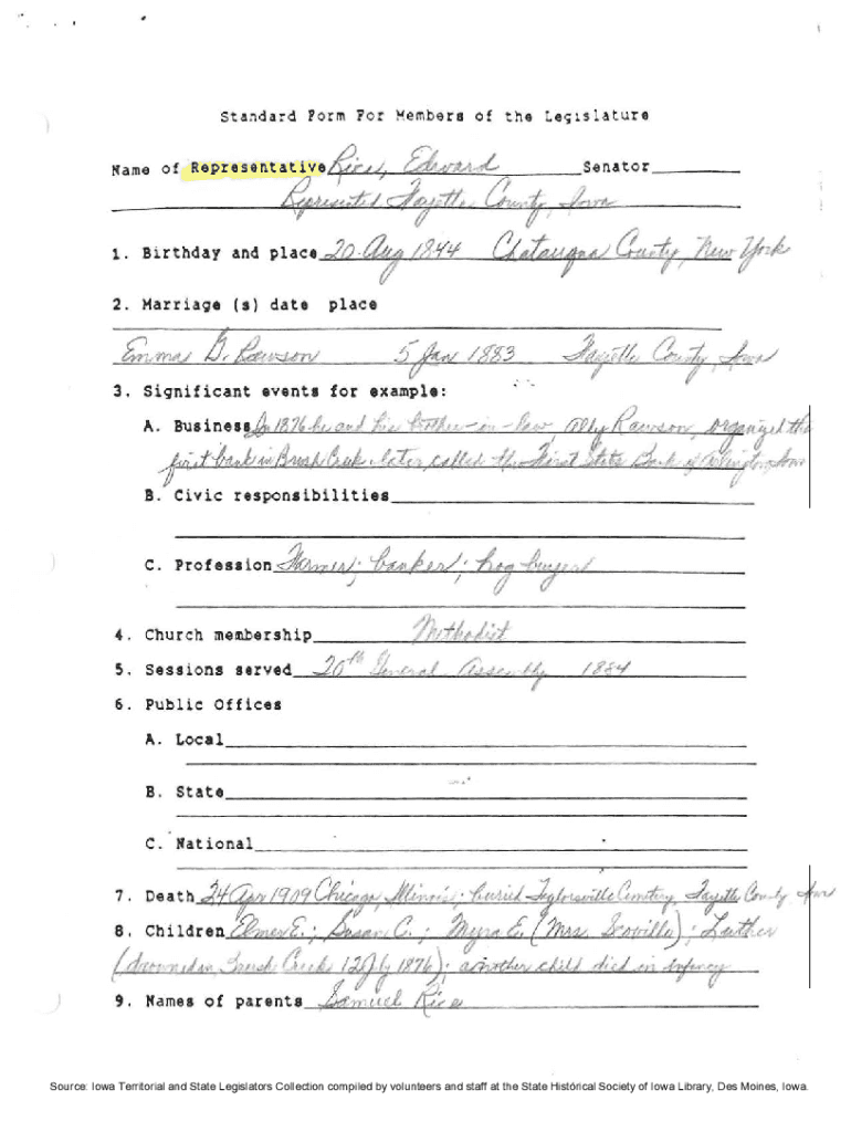 . Standard Form For Members of the Le91s l nature f(AME of Representative 4.ts.a/Jt1, dr7\'1, 2. Marriage (s) datefLySenator _ _ __J, .×.place3. Significant events for example:/ /1/ J, ;l4. Church