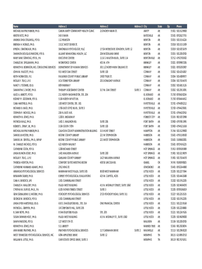 Name MICHAEL WAYNE PARKER, Ph.D. KRISTIE ETZ, Ph.D. ANDREA SHEA STAIRWELL, PAY. D. BRENDA H. NOBLES, Ph.D. BYRON J. SIMONE, Ph.D. SHANNON DOUGLAS PARSONS, PAY. D. MARY JANE SONTAG, PAY. D., PA CHARLES