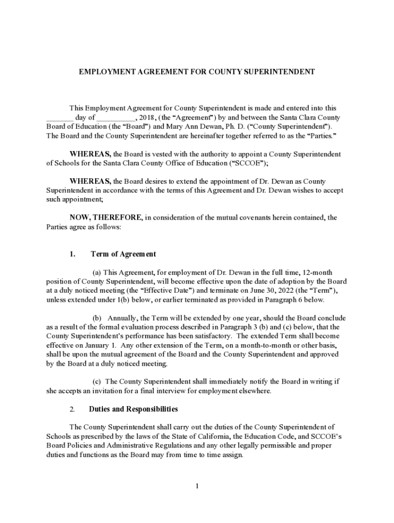 EMPLOYMENT AGREEMENT FOR COUNTY Superintendents Employment Agreement for County Superintendent is made and entered into this ___ day of ___, 2018, (the Agreement) by and between the Santa Clara County