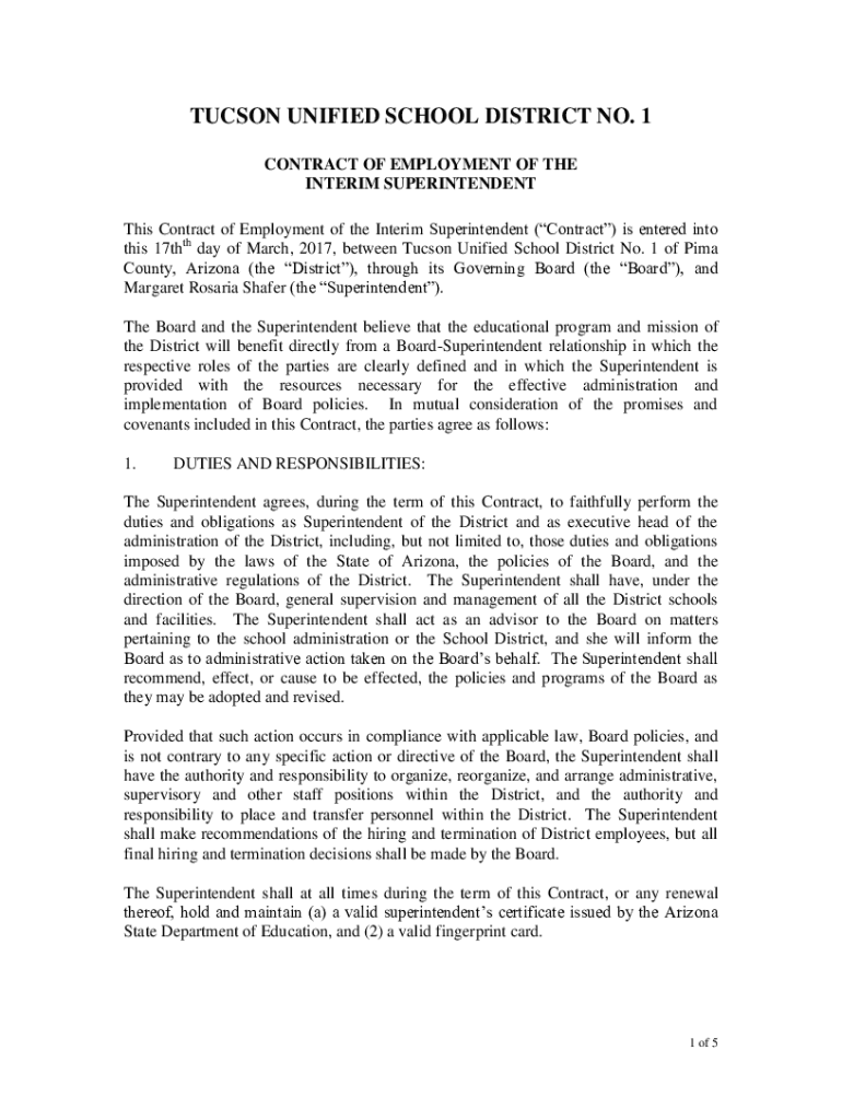 TUCSON UNIFIED SCHOOL DISTRICT NO. 1 CONTRACT OF EMPLOYMENT OF THE INTERIM SUPERINTENDENT This Contract of Employment of the Interim Superintendent (Contract) is entered into this 17thth day of March