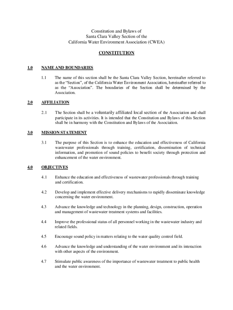 Constitution and Bylaws of Santa Clara Valley Section of the California Water Environment Association (CEA) CONSTITUTION 1.0NAME AND BOUNDARIES 1.12.0AFFILIATION 2.13.0The Section shall be a voluntarily