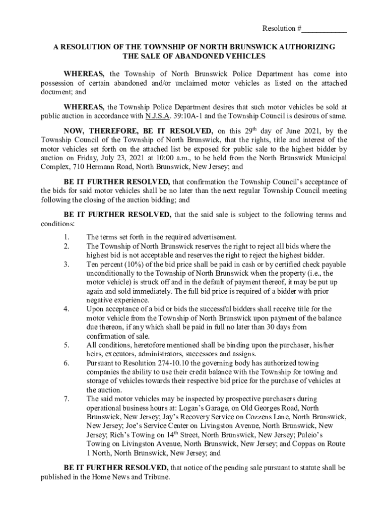 Resolution #___ A RESOLUTION OF THE TOWNSHIP OF NORTH BRUNSWICK AUTHORIZING THE SALE OF ABANDONED VEHICLES WHEREAS, the Township of North Brunswick Police Department has come into possession of certain