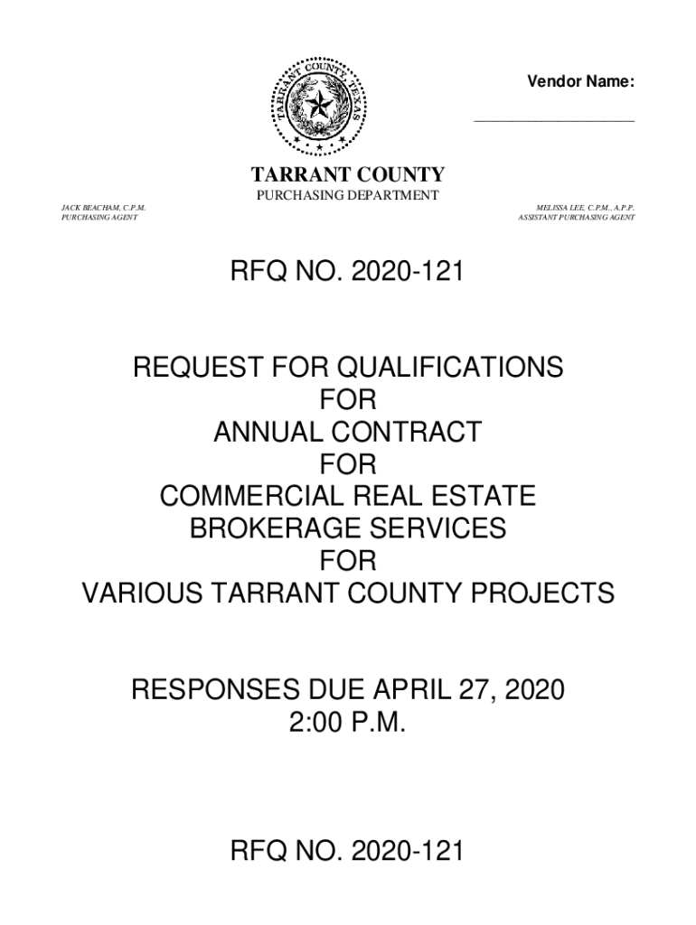 Vendor Name: ___TARRANT COUNTY PURCHASING DEPARTMENT JACK BEA CHAM, C.P.M. PURCHASING AGENTMELISSA LEE, C.P.M., A.P.P. ASSISTANT PURCHASING AGENT NO. 2020121REQUEST FOR QUALIFICATIONS FOR ANNUAL CONTRACT