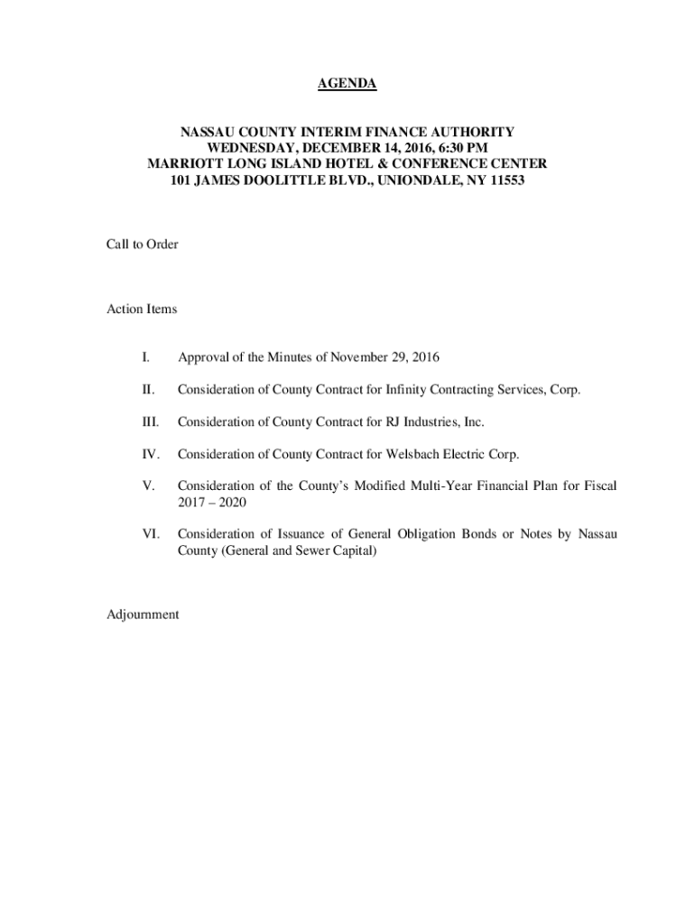 AGENDANASSAU COUNTY INTERIM FINANCE AUTHORITY WEDNESDAY, DECEMBER 14, 2016, 6:30 PM MARRIOTT LONG ISLAND HOTEL & CONFERENCE CENTER 101 JAMES DOOLITTLE BLVD., UNIONDALE, NY 11553Call to Operation Items.