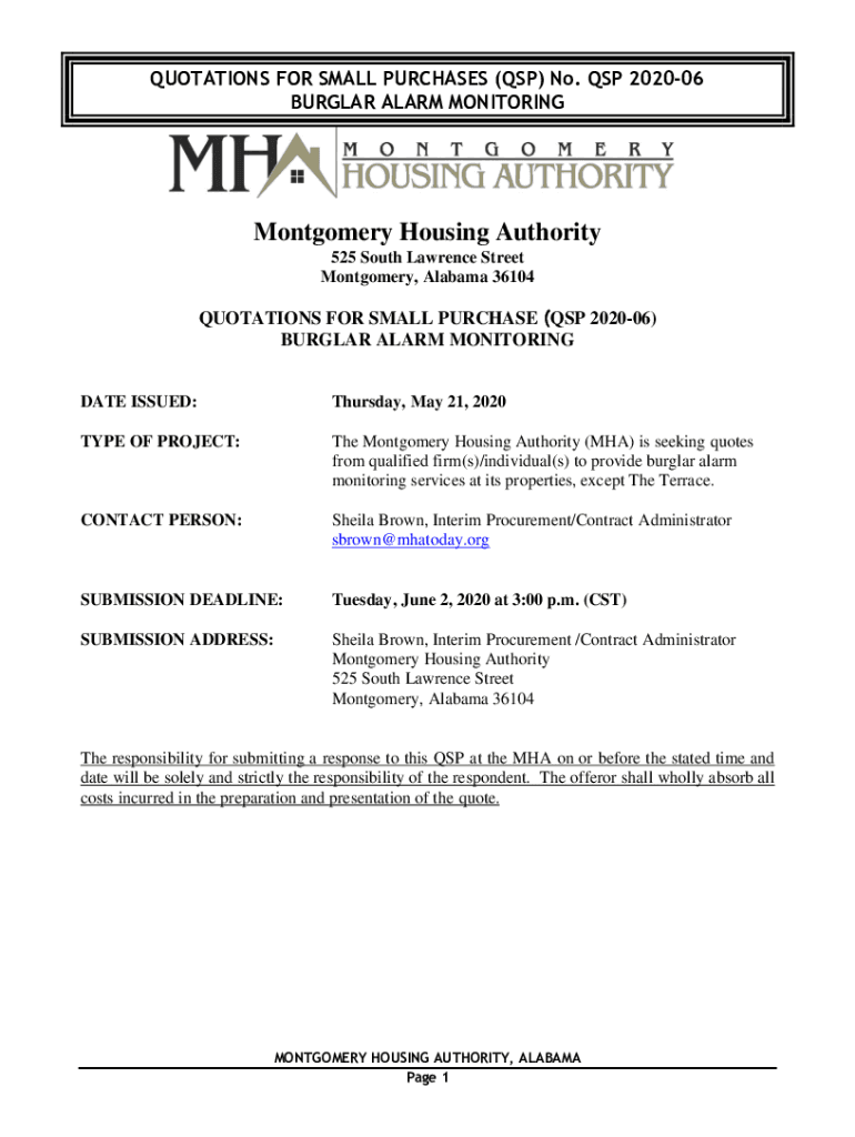 QUOTATIONS FOR SMALL PURCHASES (DSP) No. DSP 202006 BURGLAR ALARM MONITORING Montgomery Housing Authority 525 South Lawrence Street Montgomery, Alabama 36104QUOTATIONS FOR SMALL PURCHASE (DSP 202006)