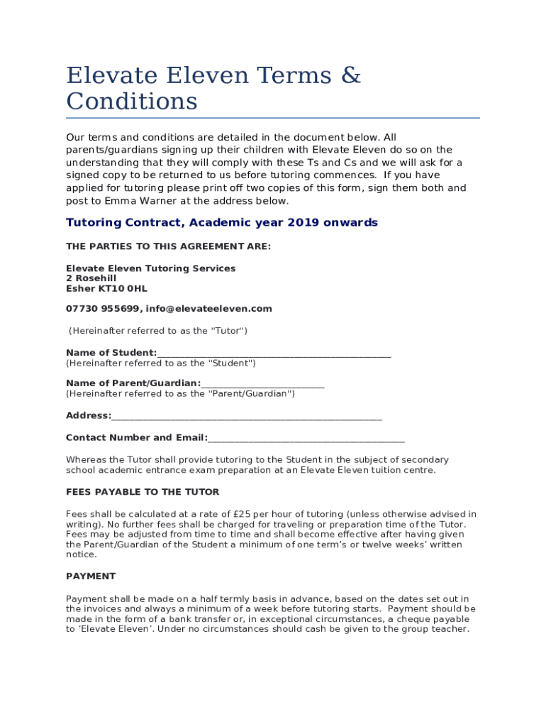 Elevate Eleven Terms & Conditions Our terms and conditions are detailed in the document below. All parents/guardians signing up their children with Elevate Eleven do so on the understanding that they