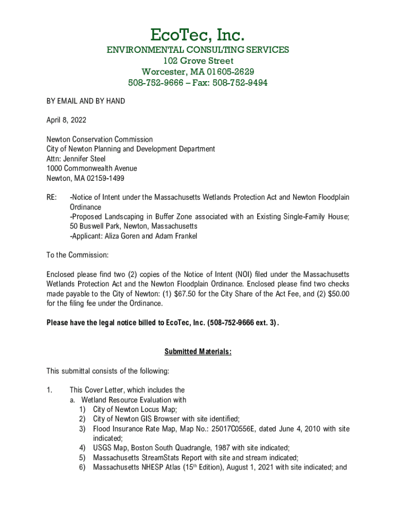Evotec, Inc. ENVIRONMENTAL CONSULTING SERVICES 102 Grove Street Worcester, MA 016052629 5087529666 Fax: 5087529494 BY EMAIL AND BY HAND April 8, 2022, Newton Conservation Commission City of Newton