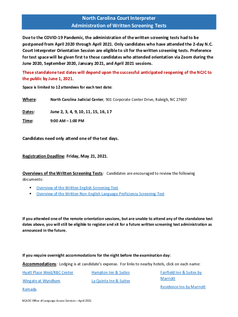 North Carolina Court Interpreter Administration of Written Screening Tests Due to the COVID-19 Pandemic, the administration of the written screening tests had to be postponed from April 2020 through
