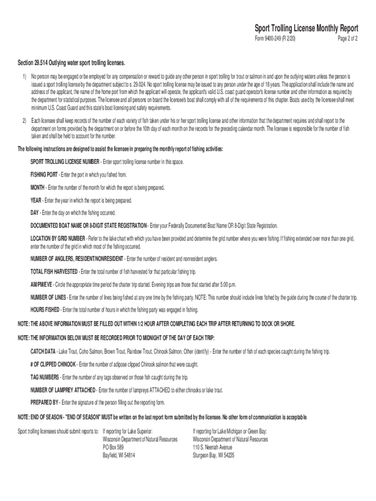 Sport Trolling License Monthly Report Form 9400249 (R 2/20)Page 2 of 2Section 29.514 Outlying water sport trolling licenses. 1)No person may be engaged or be employed for any compensation or reward
