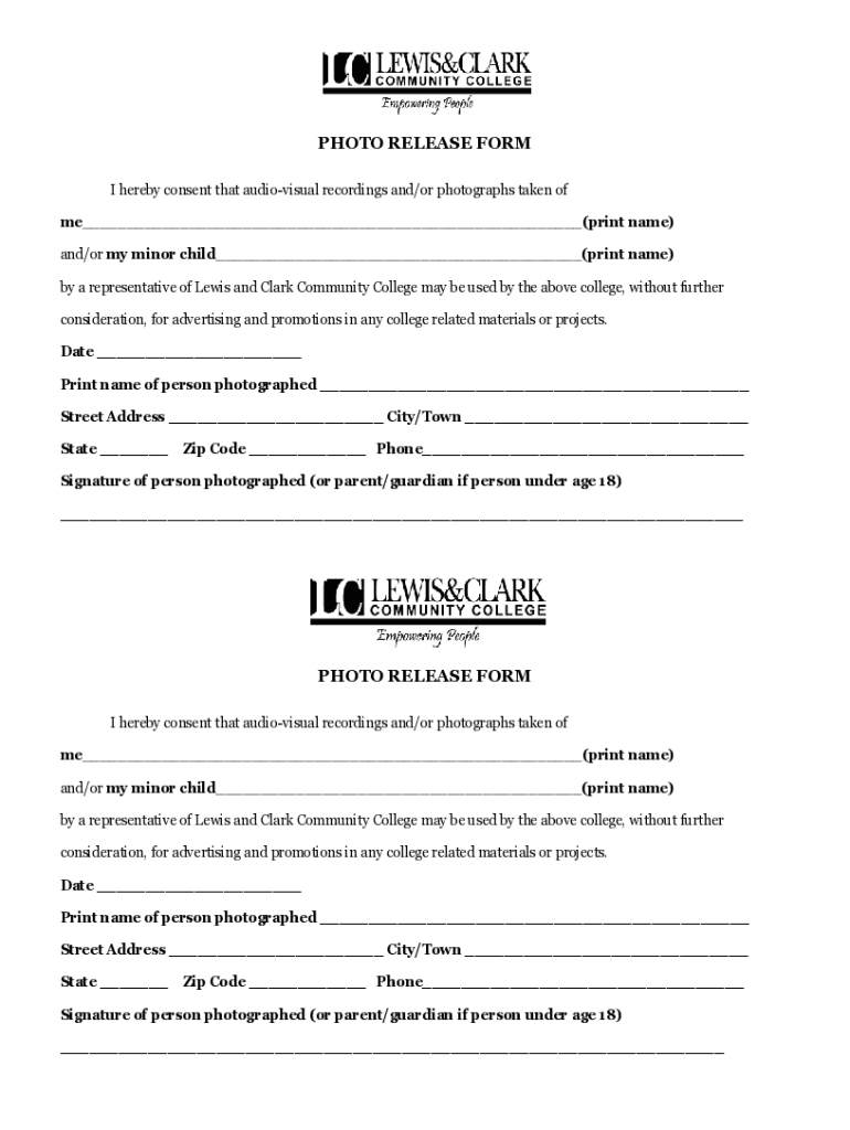 PHOTO RELEASE FORM I hereby consent that audiovisual recordings and/or photographs taken of me___(print name) and/or my minor child___(print name) by a representative of Lewis and Clark Community