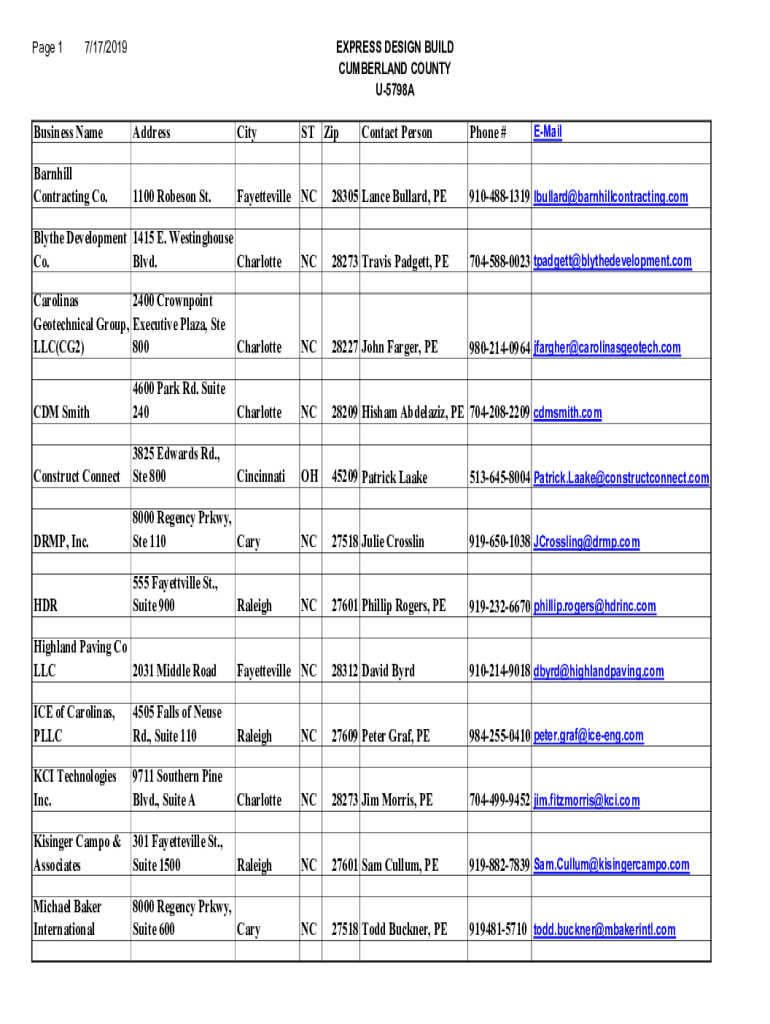 Page 1EXPRESS DESIGN BUILD CUMBERLAND COUNTY U5798A7/17/2019Business NameAddressCityST Contact Persephone #Barn hill Contracting Co.1100 Robeson St. FayettevilleNC28305 Lance Ballard, PE9104881319