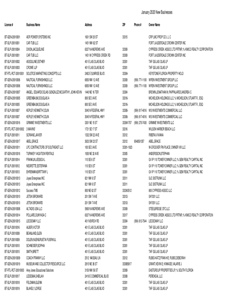 January 2020 New Businesses License #Business NameAddressZIPPhone #Owner NameBTGEN20010001ADR POWER SYSTEMS INC1601 SW 20 ST33315BTSLP20010001CAR TUB LLC1451 NW 62 STBTSLP20010004DIXON,JACQUELINE6327