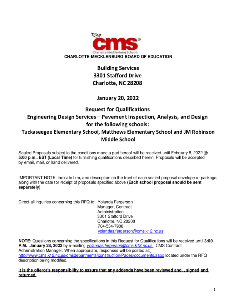 CHARLOTTEMECKLENBURG BOARD OF EDUCATIONBuilding Services 3301 Stafford Drive Charlotte, NC 28208 January 20, 2022, Request for Qualifications Engineering Design Services Pavement Inspection, Analysis,