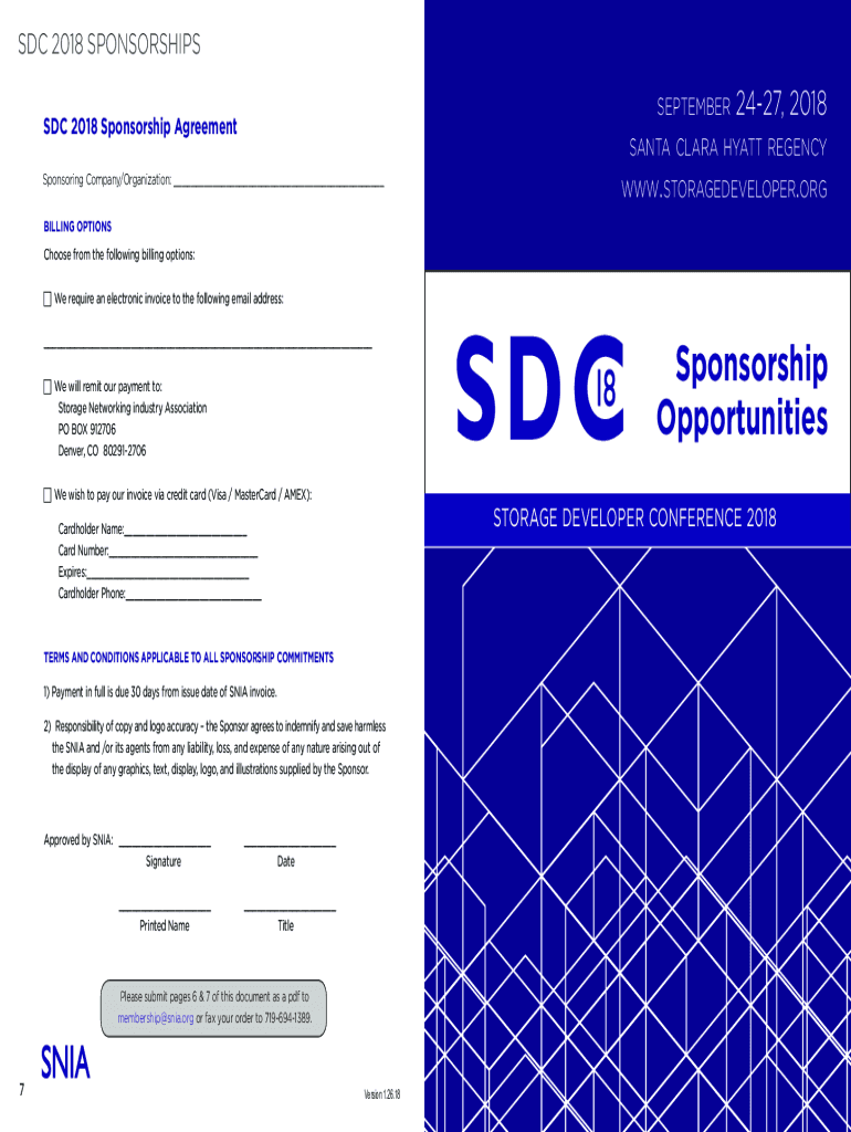 SDC 2018 SPONSORSHIPS Septembers 2018 Sponsorship Agreement2427, 2018santa Clara Hyatt regencySponsoring Company/Organization: ___www.storagedeveloper.orgBILLING OPTIONS Choose from the following