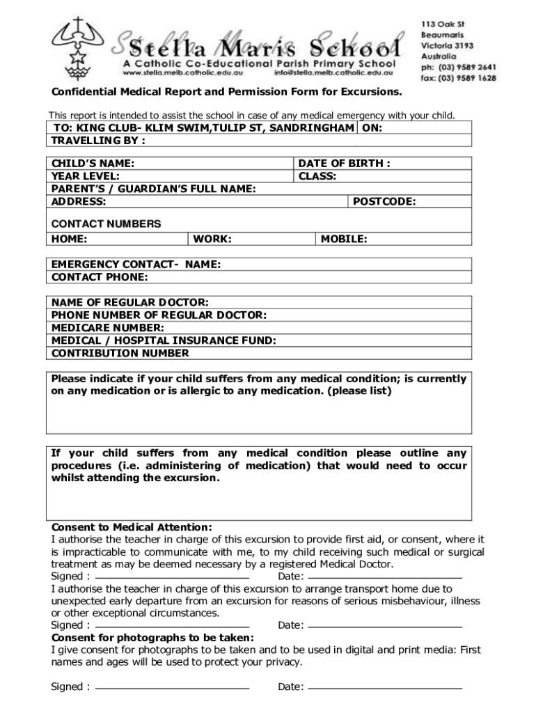Confidential Medical Report and Permission Form for Excursions. This report is intended to assist the school in case of any medical emergency with your child.TO: KING CLUB SLIM SWIM, TULIP ST, SANDRINGHAM