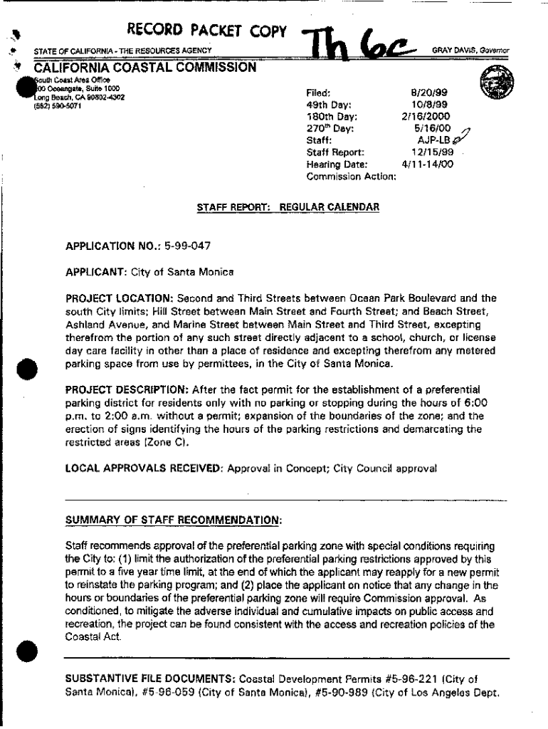 RECORD PACKET COPY.!#GRAY DAVIS, Governorate OF California THE RESOURCES AGENCYCALIFORNIA COASTAL COMMISSION out Coast Area Office00 Ocean gate, Suite 1000 ONG Beach, CA 908024302Filed:49th Day: 180th