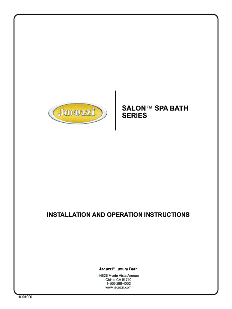 SALON SPA BATH SERIESINSTALLATION AND OPERATION INSTRUCTIONS Jacuzzi Luxury Bath 14525 Monte Vista Avenue Chino, CA 91710 18002884002 www.jacuzzi.com HD91000EnglishSalon Spa Bath Page 2www.jacuzzi.installation