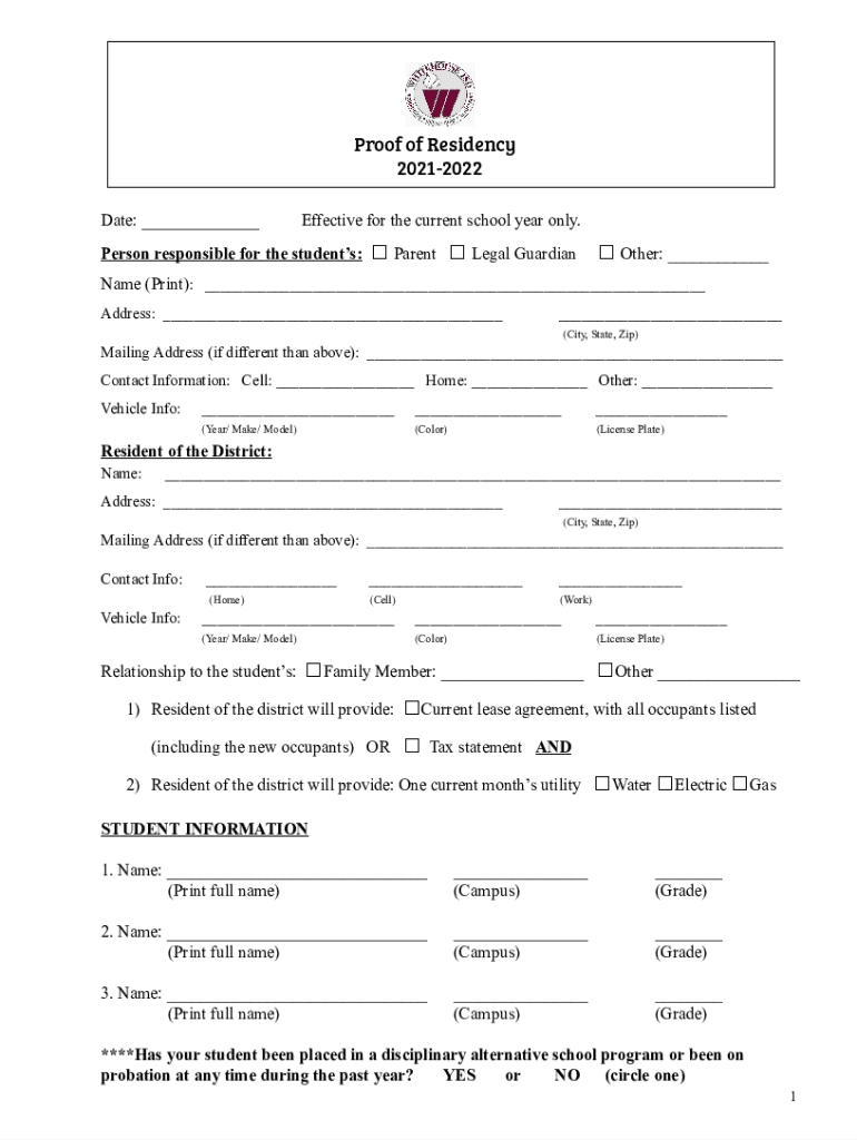 ProofofResidency 20212022 Date:___Effectiveforthecurrentschoolyearonly. Parent LegalGuardian Other:___ Personresponsibleforthestudents: Name(Print): ___ Address: ___ ___ (City, State, Zip)