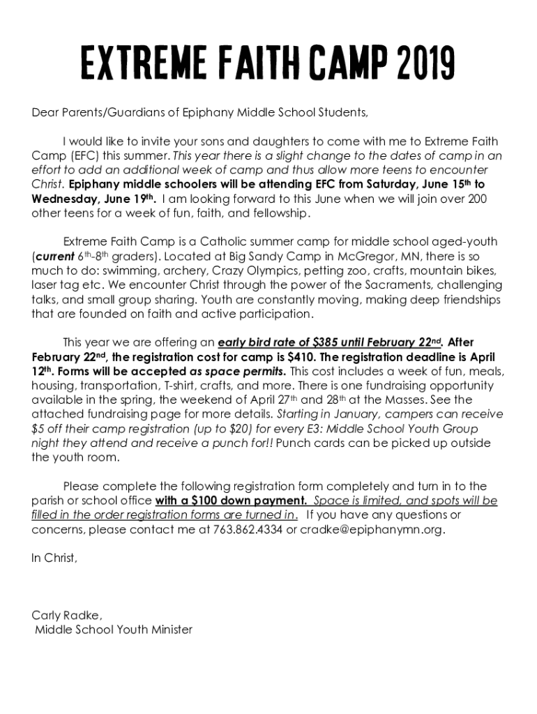 Extreme Faith Camp 2019 Dear Parents/Guardians of Epiphany Middle School Students, I would like to invite your sons and daughters to come with me to Extreme Faith Camp (EFC) this summer. This year