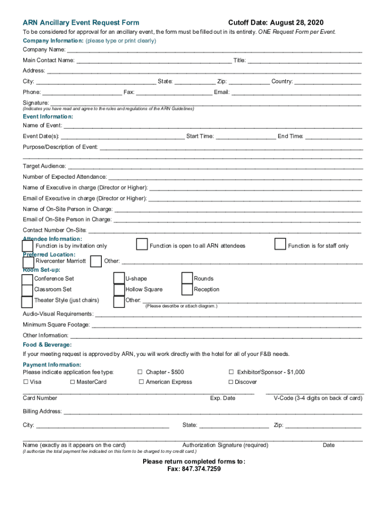 ARN Ancillary Event Request Form Request Deadline: August 28, 2020Events with 5 or more attendees will require the use of this form If your company would like to obtain meeting or event space during