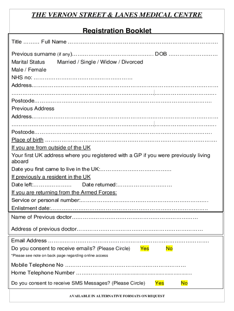 THE VERNON STREET & LANES MEDICAL Center Registration Booklet Title Full Name. Previous surname (if any)... DOB Marital StatusMarried / Single / Widow / Divorced Male / Female NHS no: Address.