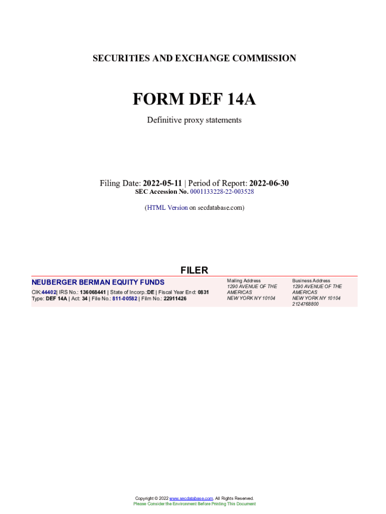 Get the free NEUBERGER BERMAN EQUITY FUNDS Form DEF 14A Filed 2022-05-11. Accession Number