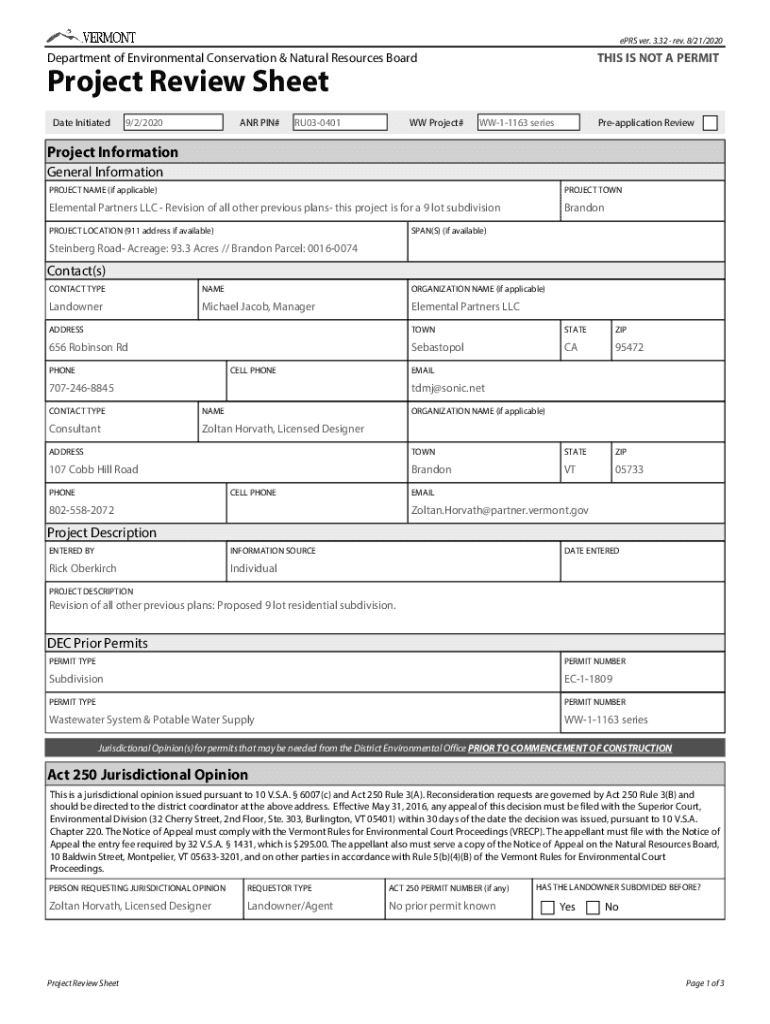 EARS very. 3.32 rev. 8/21/2020Department of Environmental Conservation & Natural Resources Boards IS NOT A PERMITProject Review Sheet Date Initiated9/2/2020ANR PIN×RU030401WW Project×Reapplication