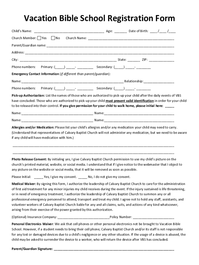 Vacation Bible School Registration Form Child's Name: ___ Age: ___ Date of Birth: ___ /___ /___ Church Member: Yes No Church Name: ___Parent/Guardian name: ___ Address: ___ City: ___ State: ___ ZIP: