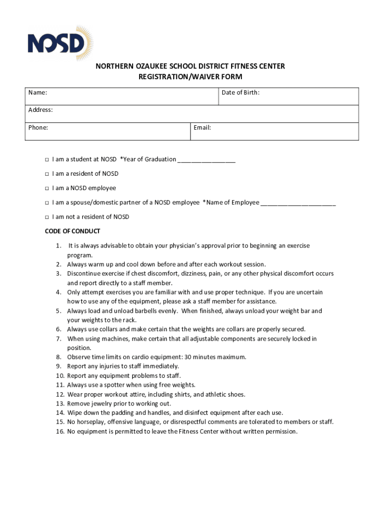 NORTHERN YANKEE SCHOOL DISTRICT FITNESS CENTER REGISTRATION/WAIVER FORM Name:Date of Birth:Address: Phone:Email: I am a student at NOSE *Year of Graduation ___ I am a resident of NOSE I am a NOSE