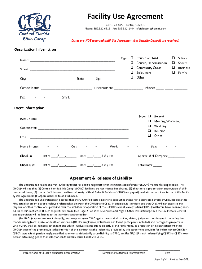 Facility Use Agreement 23813 CR 44A Eustis, FL 32736 Phone: 352.357.6316 Fax: 352.357.1444 cfbiblecamp×Gmail.competes are NOT reserved until this Agreement & a Security Deposit are received. Organization
