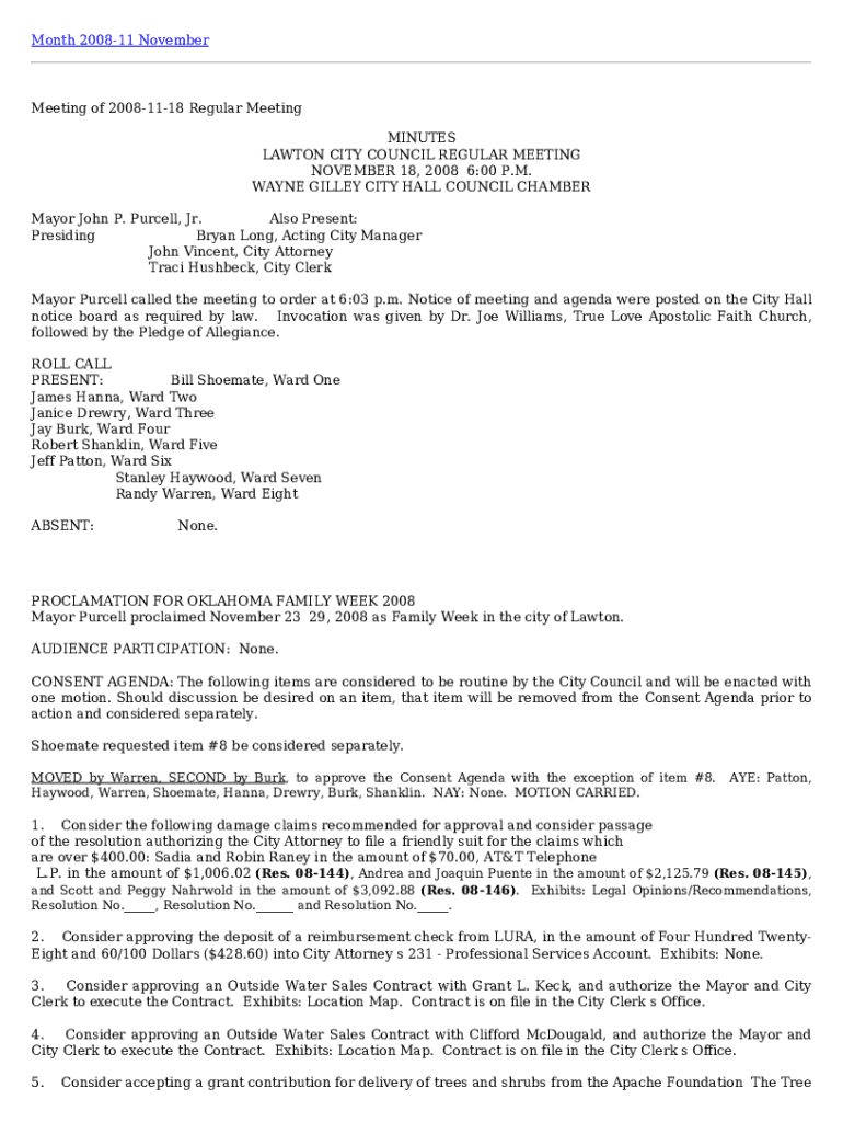 Month 200811 NovemberMeeting of 20081118 Regular Meeting MINUTES LAWTON CITY COUNCIL REGULAR MEETING NOVEMBER 18, 20086:00 P.M. WAYNE GALLEY CITY HALL COUNCIL CHAMBER Mayor John P. Purcell, Jr. Also,